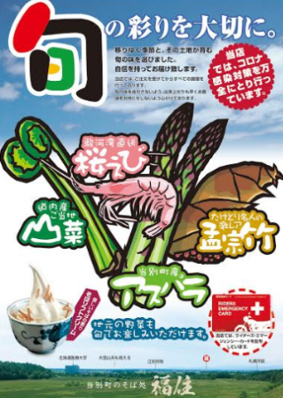 すべての料理は注文を受け付けてから作り、ストレスを感じない提供時間を心掛けています。出来るだけ地産地消に努め地元農家との交流を深め新鮮な食材を直接買いしています。味に関しては甘さにこだわりました。甘いけれど甘くない、口に残らない甘さを研究して様々な砂糖で試作してみました。天ぷら,かつなど揚げ物が多いので揚げ油にもこだわっています。いわゆる健康油でコレステロールは気にしなくてよい油を使用しています。女性の方には嬉しいニュースです。毎年春先にかけて旬の食材を提供しています。静岡駿河湾直送の桜えびのかき揚げ,当別産アスパラの天ぷら,地元の山菜のもり合わせ天ぷら,京都産孟宗竹のてんぷらなど季節の旬の彩りを大切にしています。